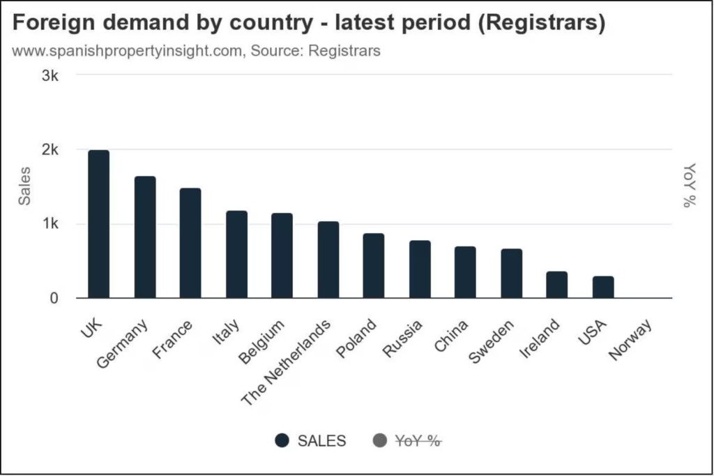 W drugim kwartale Brytyjczycy po raz kolejny stanowili największą grupę zagranicznych nabywców hiszpańskich nieruchomości – kupili ich 1.998. Za nimi uplasowali się Niemcy i Francuzi. Poniższy wykres przedstawia sprzedaż według krajów, skupiając się na narodowościach, które najczęściej kupują drugie domy i nieruchomości inwestycyjne w Hiszpanii. Wykres kołowy natomiast przedstawia udział każdej narodowości.